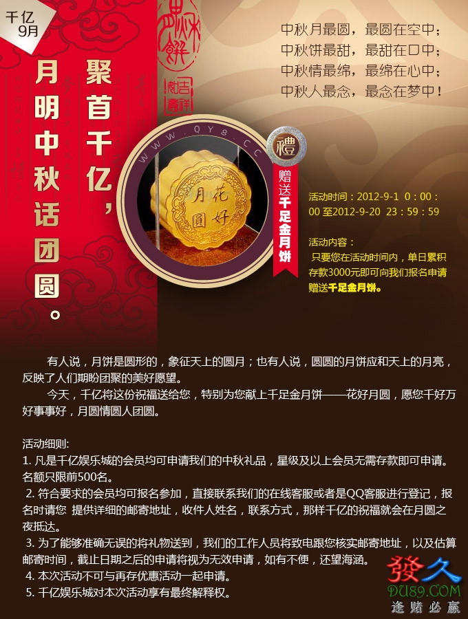 1.单日累积存款3000元即可向我们报名申请赠送千足金月饼. 2.星级及以上会员无需存款即可申请赠送千足金月饼. 3.名额只限前500名. 发久论坛运佳中国 winjia (发久论坛)http://www.du89.com