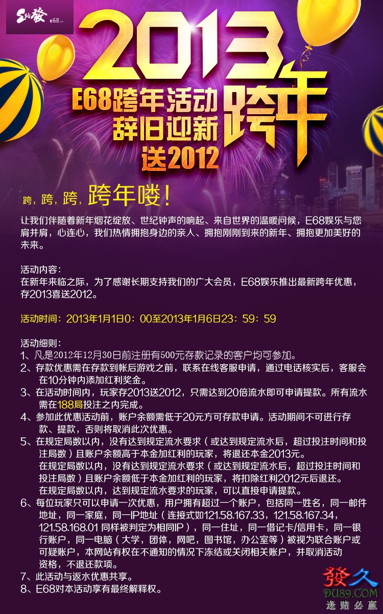 存2013送2012,只需20倍流水,凡是2013.1.1日前注册会员均可申请,运佳专业预测分析 博彩策略 http://www.du89.com/